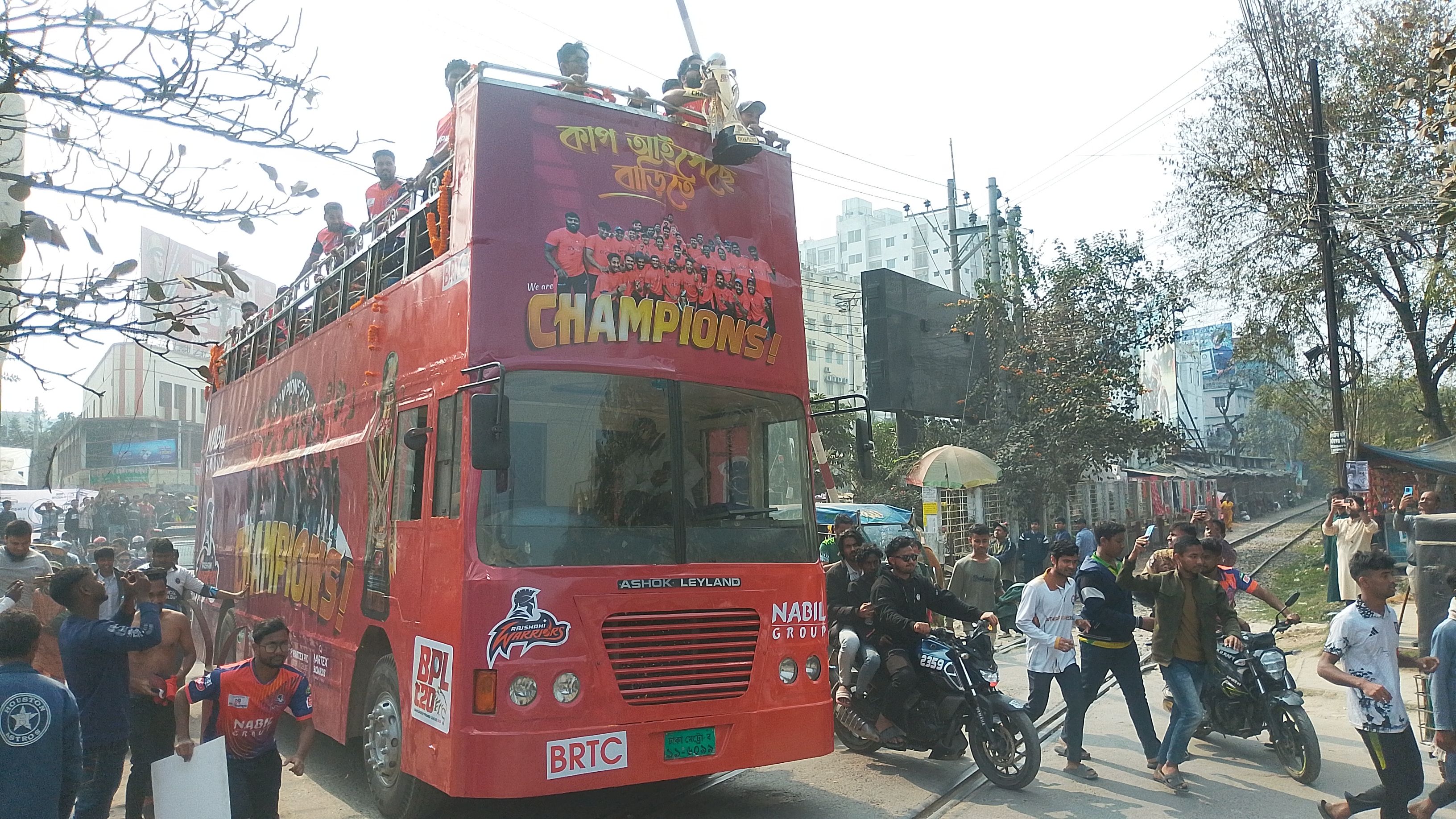 বিপিএল (বাংলাদেশ প্রিমিয়ার লীগ) ট্রফি জয়ের আনন্দে ছাদখোলা বাসে করে রাজশাহী শহর প্রদক্ষিণ করেছেন অধিনায়ক নাজমুল হোসেন শান্ত ও মুশফিকুর রহিমসহ দলের অন্যান্য খেলোয়াড়রা। সোমবার (২৬ জানুয়ারি) রাজশাহীর গুরুত্বপূর্ণ সড়কগুলোতে এই বিজয় মিছিল অনুষ্ঠিত হয়। ছাদখোলা বাসে বিপিএল ট্রফি উঁচিয়ে ধরে সমর্থকদের অভিবাদন জানান শান্ত-মুশফিকরা।