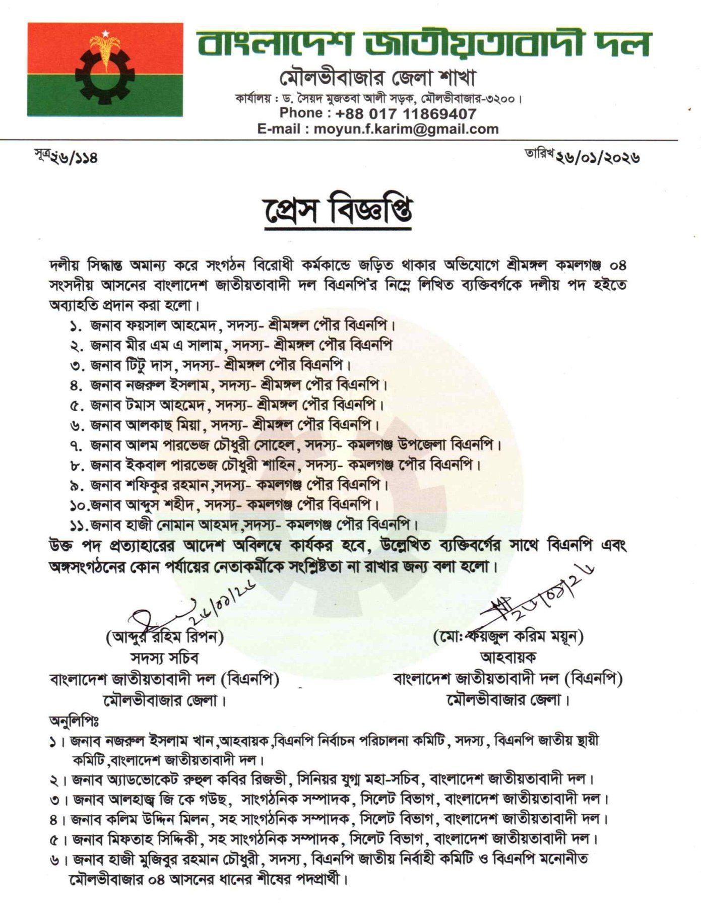 মৌলভীবাজার জেলা বিএনপির আহ্বায়ক মো. ফয়জুল করিম ময়ূন ও সদস্য সচিব মো. আব্দুর রহিম রিপনের স্বাক্ষরিত বিজ্ঞপ্তিতে বলা হয়, দলীয় সিদ্ধান্ত অমান্য করে সংগঠনবিরোধী কর্মকাণ্ডে জড়িত থাকার অভিযোগে সংশ্লিষ্টদের পদ থেকে অব্যাহতি দেওয়া হয়েছে। এ আদেশ অবিলম্বে কার্যকর হবে।